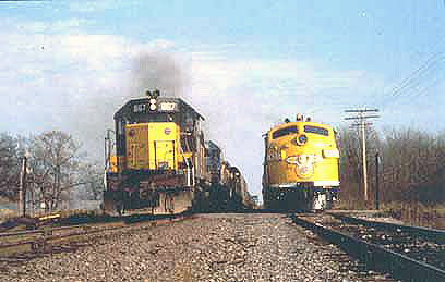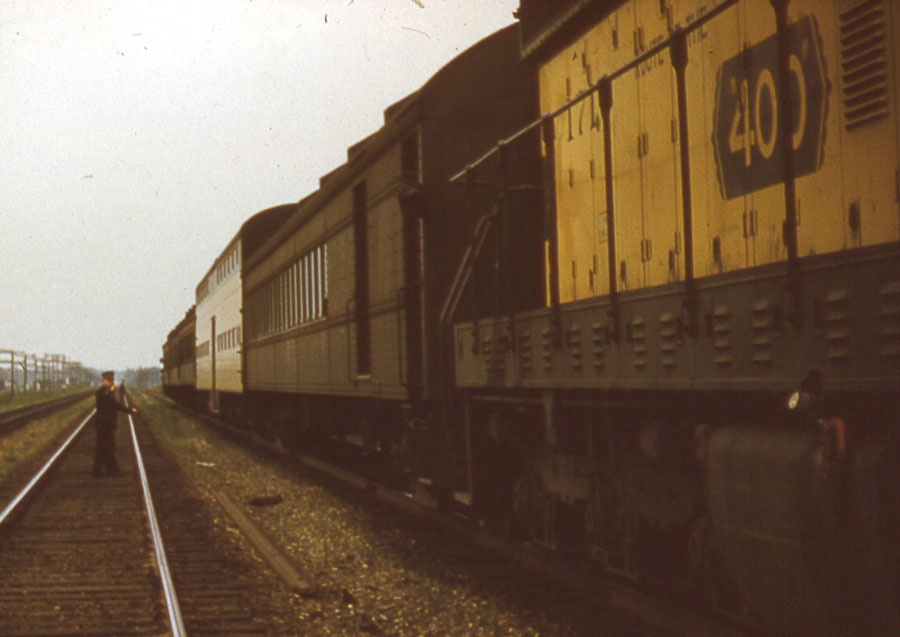 Here’s a scoot on the main line at West Chicago back in 1959. If you look real close, that’s Conductor Willie O’Brian off to the left. How long has it been since anyone’s seen a consist like this? Thanks to Charlie McLaughlin for this “trip back in time.” |
