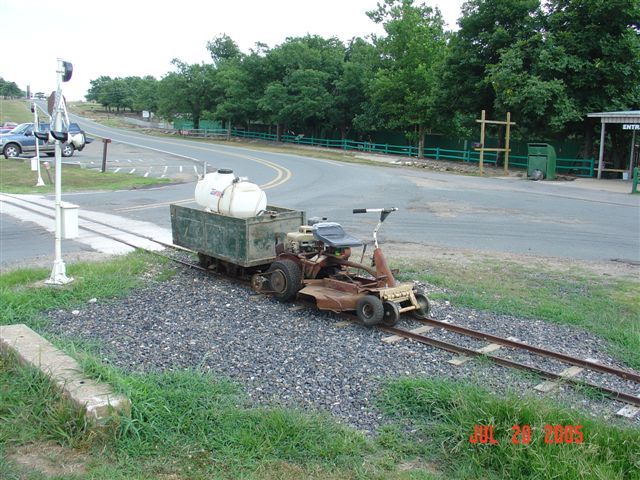 From Ed Henry comes this photo of the latest in railroad weed control technology. Ed discovered this high-tech rig in use at Arkansas’ Queen Wilhelmina state park on 07/20/05 where it’s “death on weeds” on their miniature train right-of-way. Some folks think Arkies are backward, but think of the imaginative mind & innovation it took to put this together. |