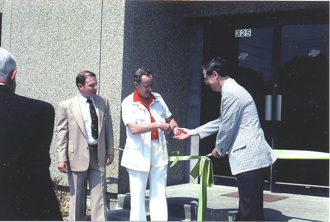 June 1982 grand opening at West Chicago with Bill Otter on the left. Eugene Rennels, then Mayor of West Chicago, is in the middle with Ed Burkhardt on the right. Thanks to Rex Hauser for identifying Gene & Ed. Photo by Mark Llanuza. |