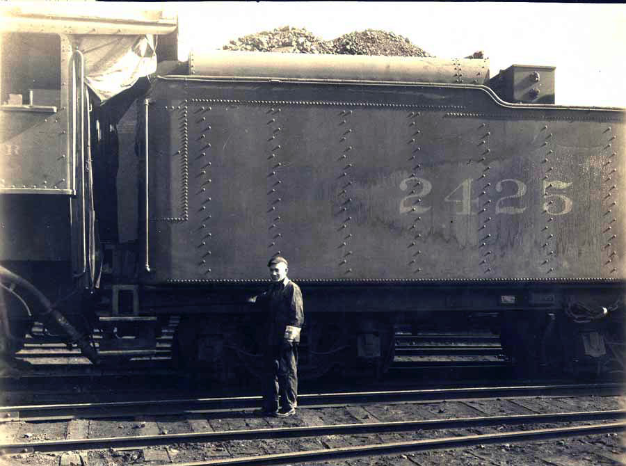 Here's one that goes way back to the 1930’s. This is Earl Clotfelter, a machinist at Boone, Iowa standing alongside the 2425, a hand fired Class J engine. Mr. Clotfelter’s grandson, Stan Eyres, contributed the picture. |