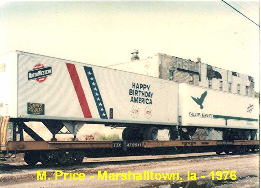 From Merrill Price, we have this 1976 picture of a Chicago & North Western “Happy Birthday America” trailer taken at Marshalltown Iowa. |