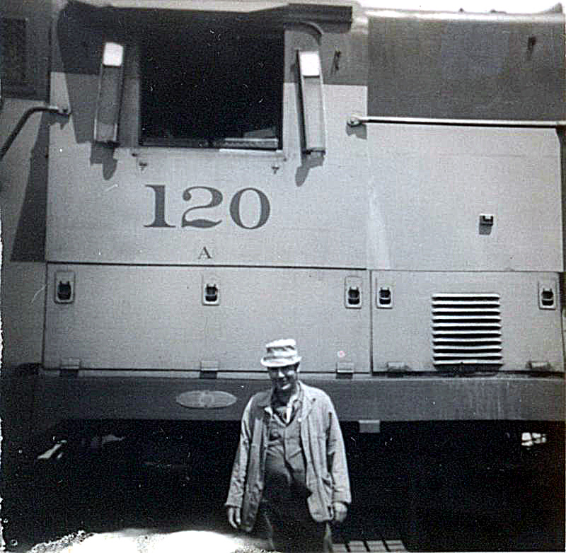 Here are 4 photos of retired Conductor Bill Linsey. Bill hired out on the CGW as a Welder’s Helper in August, 1954 and transferred to train service in 1960 where he stayed until he retired in 1994. The two photos on the left show Bill at CPT around 1981 or 1982. Upper right has him in the West Chicago Locker Room in the 1970’s and the lower right view was taken at Sycamore, IL also in the 1970’s. The 120 is a former CGW engine. The photos were submitted by Bill Linsey. |