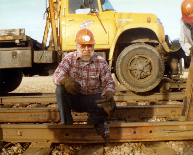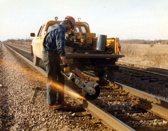 At the upper right, the bad section of rail is being cut out by Bob Steinke. Lower left is another member of the rail