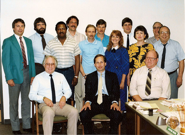 Here’s the Signal Design Group pictured at 165 N. Canal St. in the early 1980’s. Photo from Mickey Senase. Left to right, back row: Paul Stanek, Assistant Chief Engineer – Communications & Signals, now with the UP; Dale Berkes, Signal Design Manager, now with the UP; Mickey Senase, Signal Designer, now with STV, Inc.; Brad Wiehr, Signal Designer; Scott Grott, Signal Designer, now Chief Operating Officer for Metro – St. Louis; & Art Schwidel, Signal Draftsman. Middle Row: Art Barnes, Lead Signal Designer; Art Cox, Signnal Designer, now with G.E. Transportation Systems; Patty Ryan, Budget Officer; unidentified; & Harry Chadges, Signal Draftsman. Can anyone provide the name missing in this row? Front Row: Bob Benston, Manager of Signal Design; Tom Crubaugh, Chief Engineer – Communications & Signals; & Don Johnson, Director of Signal Engineering. |