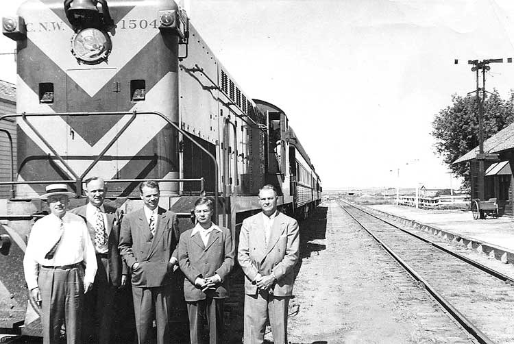 3-car Business Train at Quinn, So. Dak. in 1953. With the arrival of this train, the population of Quinn must have doubled. Our thanks to Jerry Drager for telling us the year and identifying the men in the next photo. |
