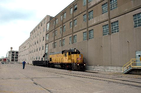 That’s Warren on the ground while the UPY 718 pulls the very last car out of the National Manufacturing Co. plant in Sterling, Illinois, 8/25/05. |