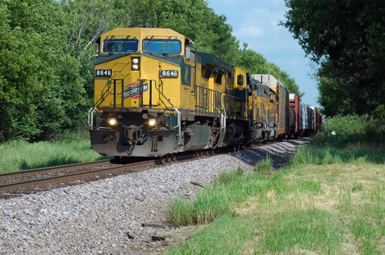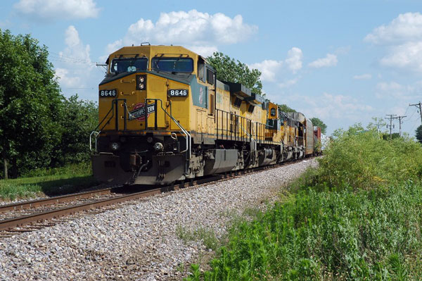 The C&NW 8646 approaches Route 25 in South Elgin